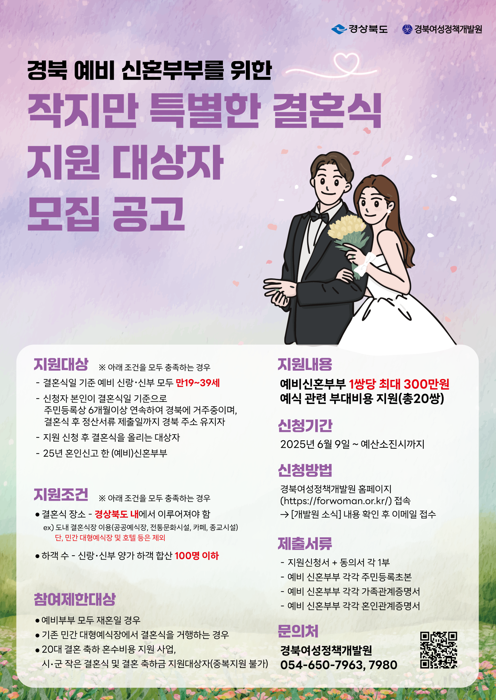 1. 지원대상: 공고일(2025. 6. 5.)이후 결혼식을 올리는 경상북도 거주 (예비)신혼부부