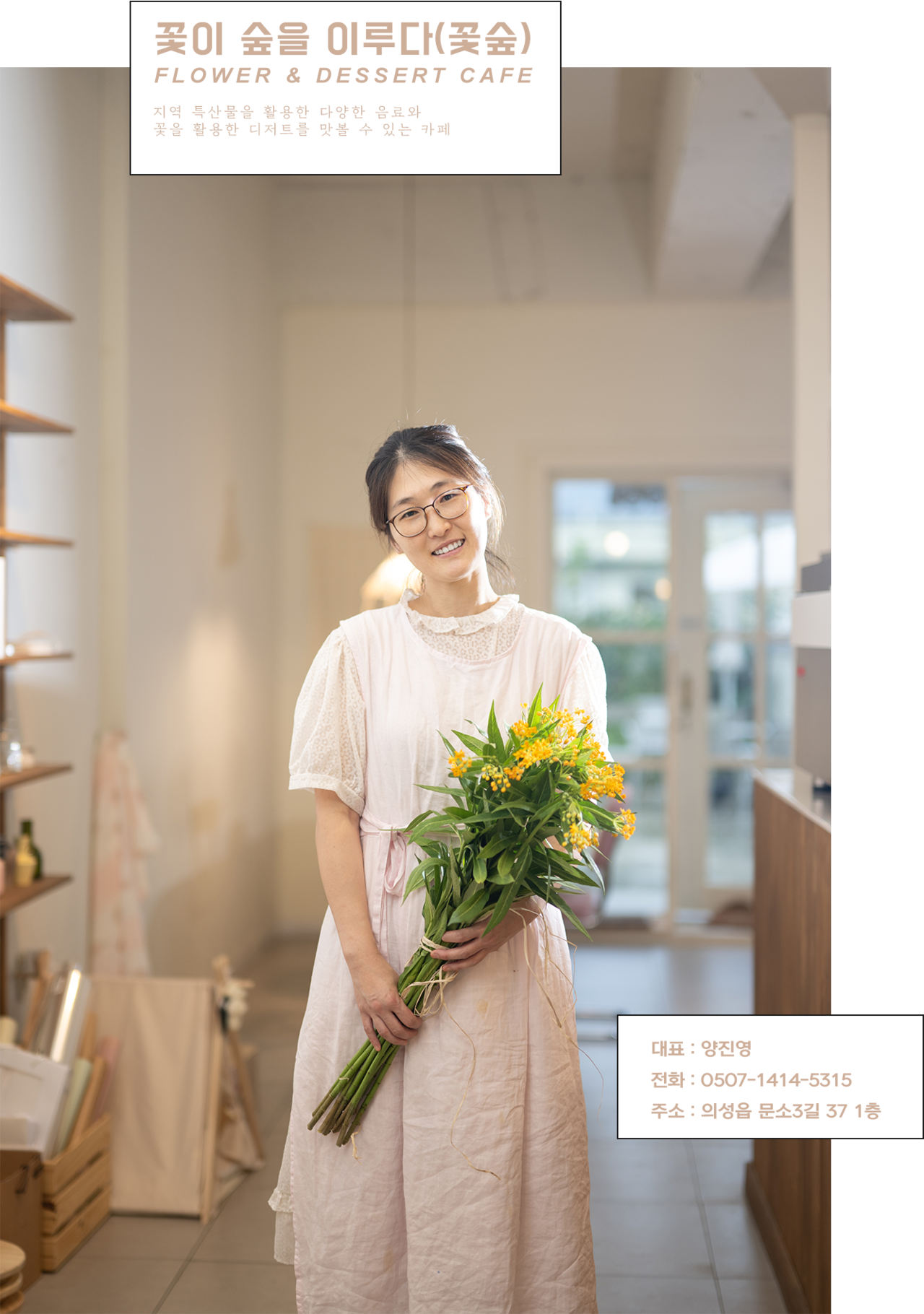 서울에서의 답답함과 자연이 있는 곳으로의 삶을 머릿속에서 생각만 하다가 행동으로 옮겨 의성으로 왔습니다. 내가 가진 경험을 통해 꽃숲을 운영하고 있어요. 누구나 와서 쉴 수 있는 공간을 만들고 있는데, 숲속에서 쉬듯이, 머물다 가는 것만으로도 편안함을 전달해드리고자 해요.